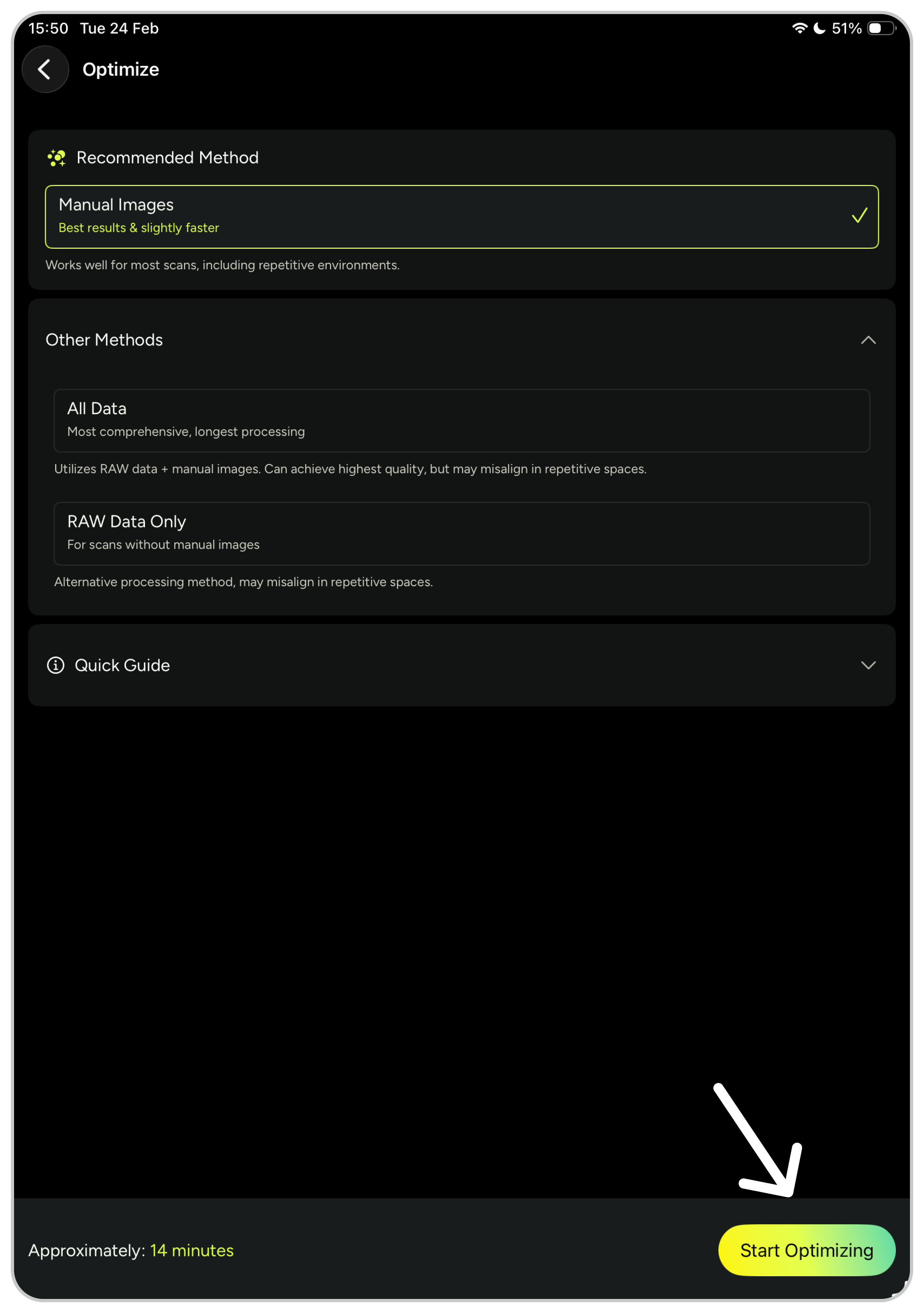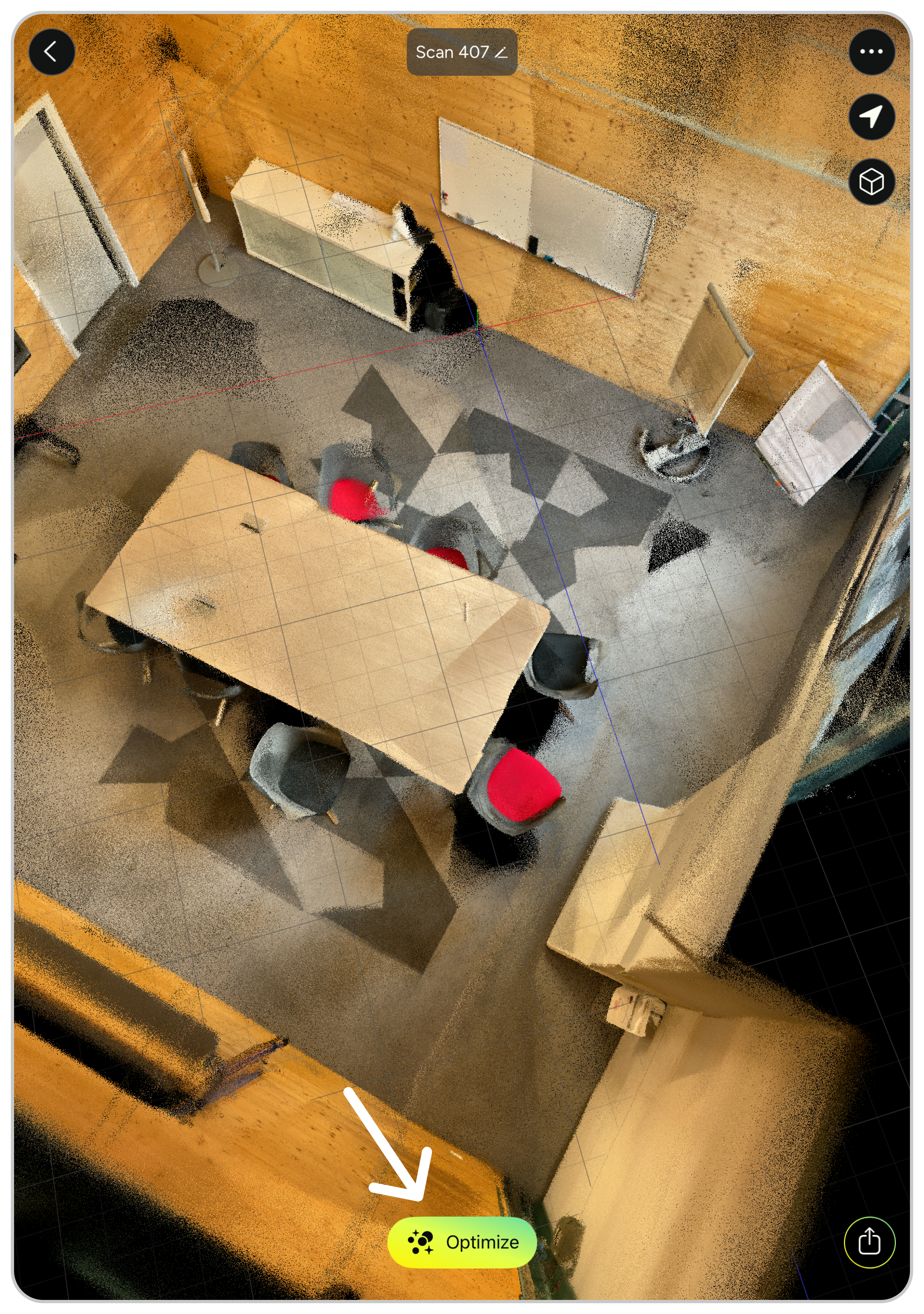- Save your scan and tap on the “Optimize” button when viewing your point cloud