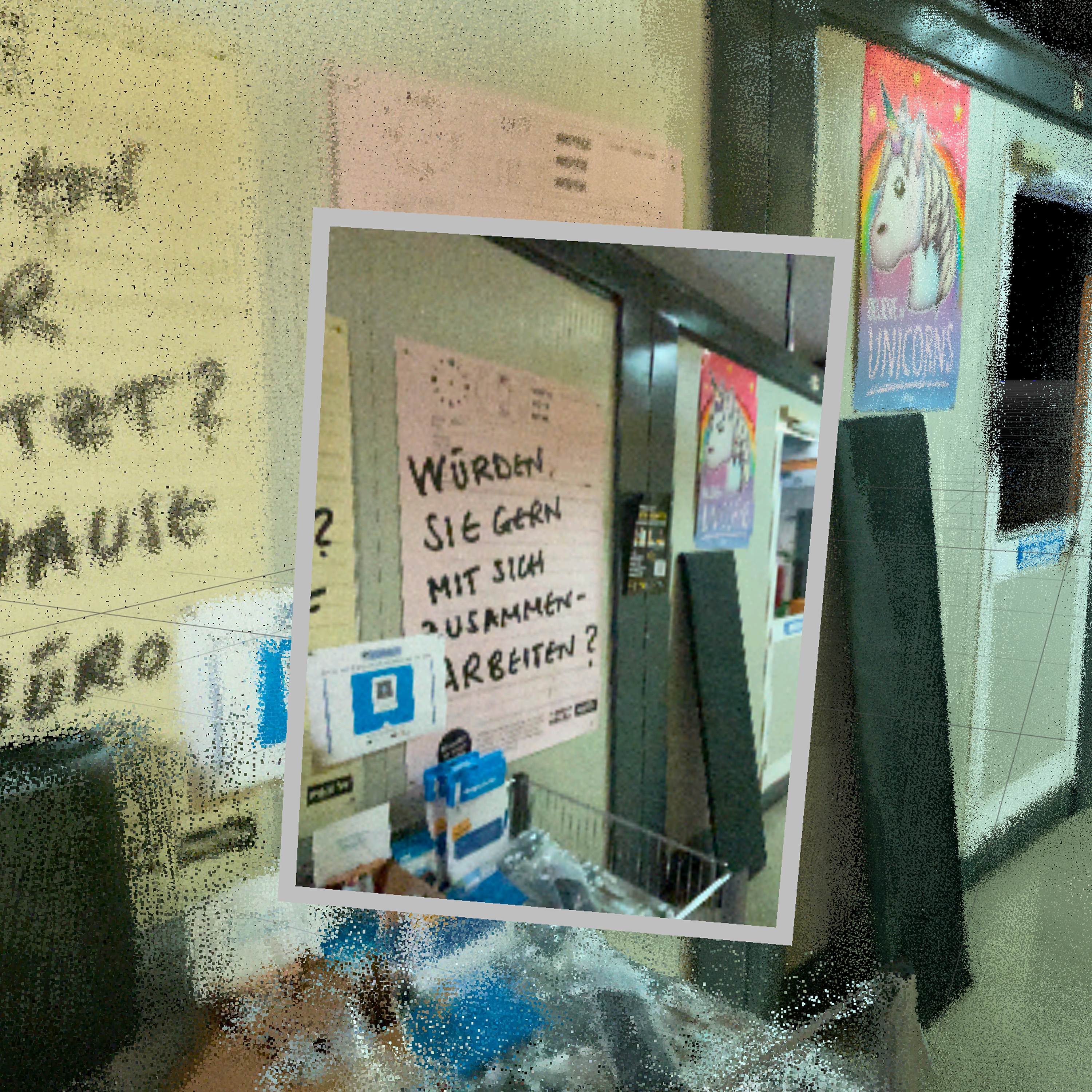Identical decorative elements, like the same poster appearing on multiple walls in a building.