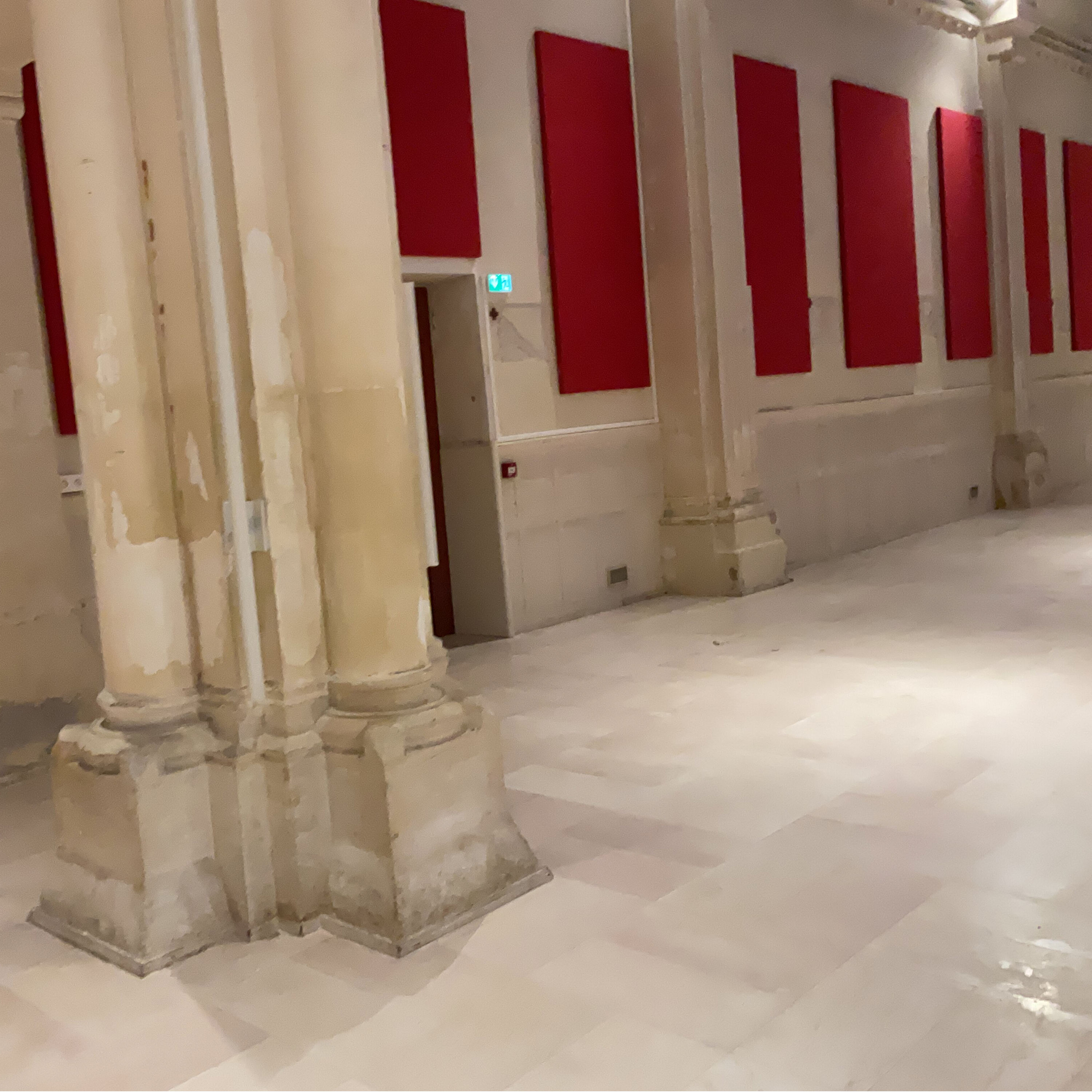 Identical structural elements repeated throughout a space, like matching pillars, windows, or similar rooms often found in offices and churches.